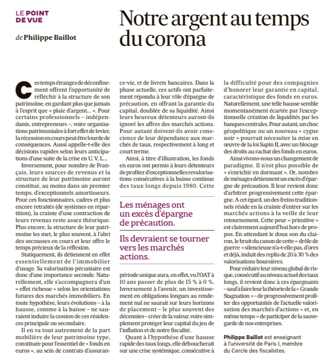 Ces temps étranges de déconfinement offrent l’opportunité de réfléchir à la structure de son patrimoine, en gardant plus que jamais à l’esprit que « plaie d’argent… ».